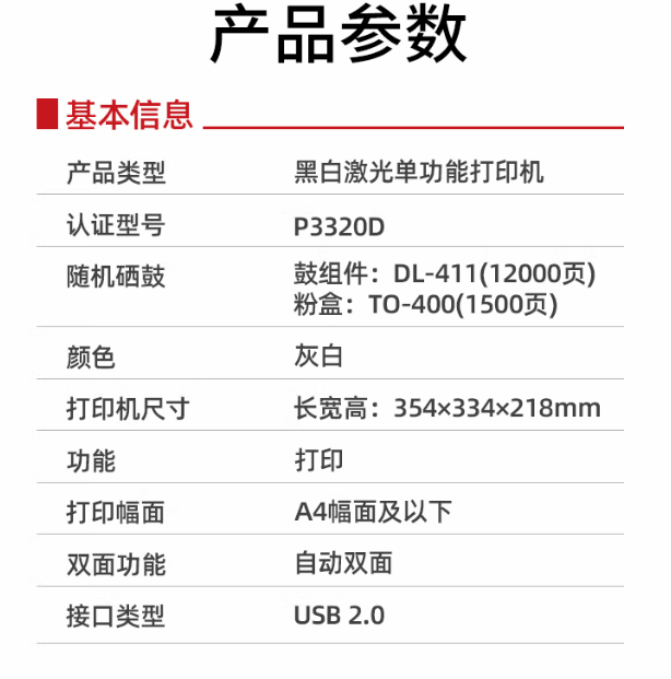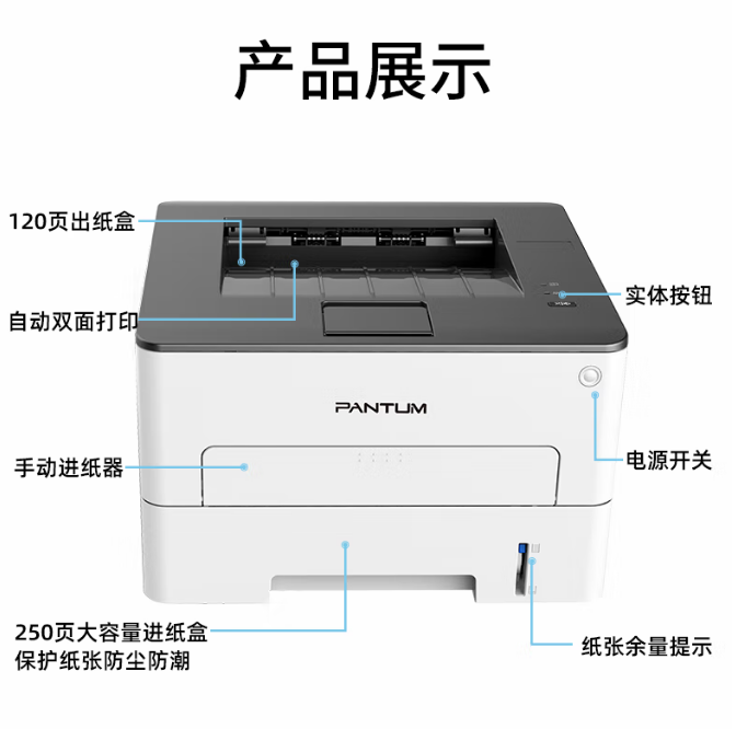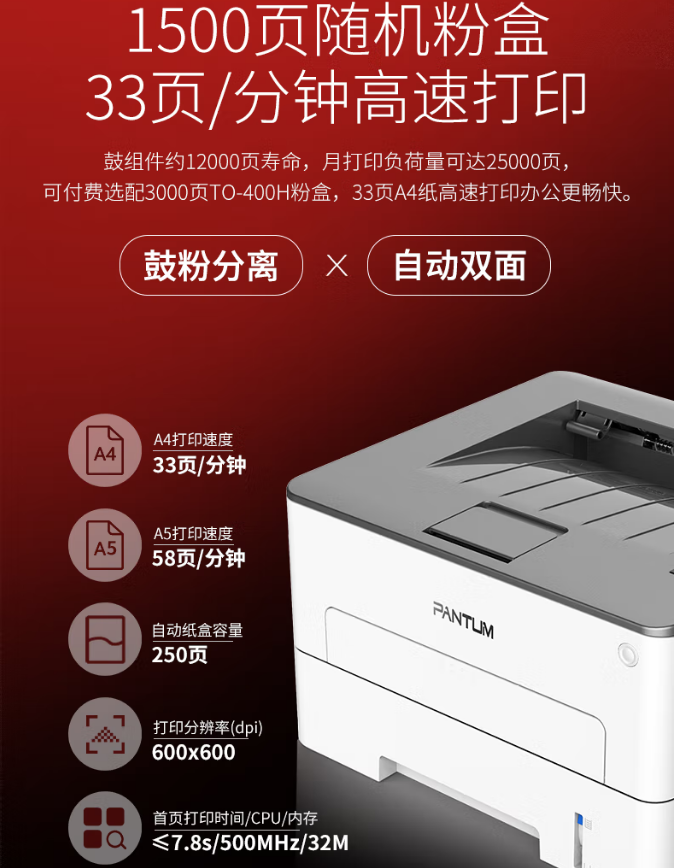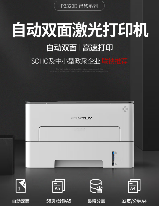 >奔图(PANTUM)P3320D A4黑白打印机商用家用激光 自动双面 单功能打印机